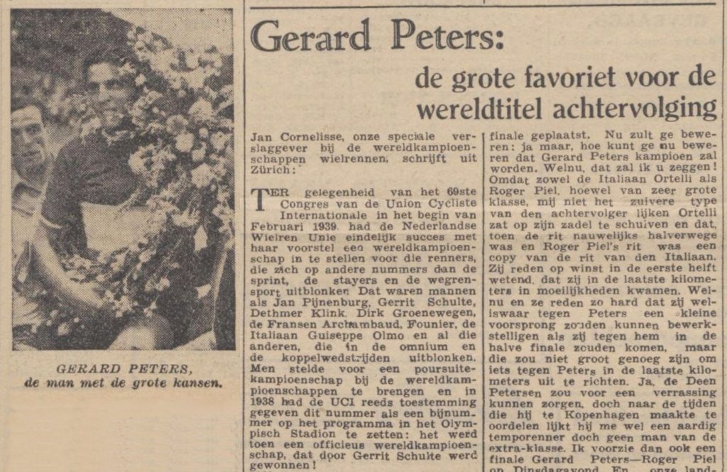1939 kwam en ook bet wereldkampioenschap voor de achtervolgers stond op het programma van Milaan ! Dethmer Klink, die blozende jongeman uit de Wieringermeer die het kampioenschap van Nederland op zijn naam had gebracht door Jan Pijnenburg te onttronen, was onze man en wat voor een. Daar op de snelle Vigorellibaan reed Klink de snelste tijd in de serie: 6 min 20.4 sec. over de 5 km en dat in een rit waarin hij ln den Engelsman Hill geen tegenstander van formaat had. Men vermoedde toen dat hij regelrecht op het wereldkampioenschap zou afstevenen, want de Fransman Louis Aimar, ook een specialist op dit nummer, achtte men tegen den Wieringer niet in staat te winnen, evenmin als de Italiaan Fabio Battesini en den Belg Somers die in hun series hard moesten vechten tegen resp. den Deen Jacobsen en den Duitser Hofmann waarbij zij tijden gemaakt hadden van 6.23 en 6.23.2. De finales werden echter niet gereden want inmiddels was het oorlog in Europa! Dethmer Klink zou deze kans nooit meer krijgen. De oorlog ging voorbij en nu in Zürich kan men dan dit nummer afwerken en wederom staat daar een landgenoot die een greep naar het wereldkampioenschap der poursuite-coureurs gaat doen: Gerard Peters!