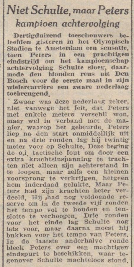 Dertigduizend toeschouwers beleefden gisteren in het Olympisch Stadion te Amsterdam een sensatie, toen Peters in een prachtige eindstrijd om het kampioenschap achtervolging Schulte sloeg, daarmede den blonden reus uit Den Bosch voor de eerste maal in zijn wielercarrière een zware nederlaag toebrengend. Zwaar was deze nederlaag zeker, niet vanwege het feit, dat Peters met enkele meters verschil won, maar wel in verband met de manier, waarop het gebeurde. Peters liep na den start onmiddellijk uit en na drie ronden lag hij twintig meter voor op Schulte. Deze beging do o.i. tactische fout om door een extra krachtsinspanning te trachten niet alleen zijn achterstand in te lopen, maar zelfs een kleinen voorsprong te verkrijgen, hetgeen hem inderdaad gelukte. Maar Peters had zijn krachten beter verdeeld. Hij had nog voldoende reserve om in de tweede vijf ronden het tempo vol te houden en tenslotte te verhogen. Drie ronden voor het einde lag Schulte nog iets voor, maar daarna moest hij bukken voor het tempo van Peters. In de laatste anderhalve ronde bleek Poters over een machtigen eindspurt te beschikken, waar tegenover Schulte machteloos stond.