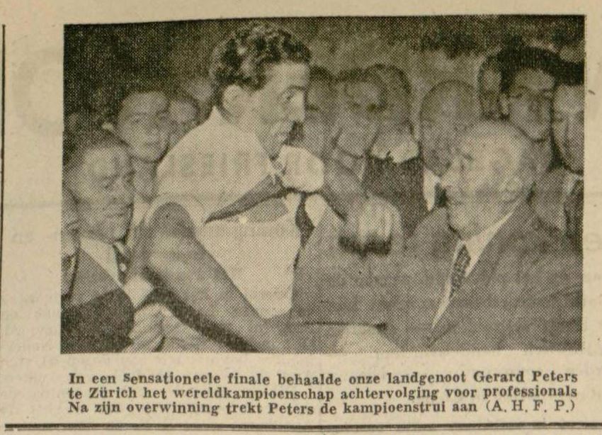 Nederland heeft zijn eersten wereldkampioen: Gerrit Peters! In de finale achtervolging, die drie minuten na middernacht op de Oerlikon-baan bij Zürich werd gehouden, versloeg onze landgenoot den Fransman Piel op meer dan overtuigende wijze.