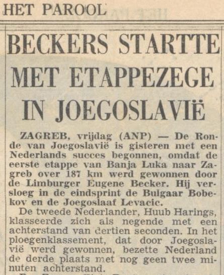 Een pracht ouverture van de Nederlandse equipe, die onder leiding van Willy Vrancken, met assistentie van Jan Willemsen als mecanicien en van Sjeng Collard als soigneur, aan de 17e Ronde van Joegoslavië deelnam. Met de 180 km-rit van Banja Luka naar het stadion van Zagreb werd een begin gemaakt aan een karwei die zeer zeker niet gemakkelijk was. Met een Hongaar, een Joegoslaaf en een Pool ging Fons Frissen dra aan de haal, om na 56 km bijgebeend te warden door een peloton van 16 renners. De nieuwe formatie geraakte tot een winst van ruim 2 min. Toen holde een troepje met Hub Harings en Eugène Beckers achter de uitlopers aan, Beckers demarreerde in zijn eentje en na een jacht van 36 km streek hij op de leiders neer. De finale was hevig, acht man hielden stand, trokken op Zagreb af. Beckers was het eerste op de stadionpiste, was ook nummer één aan de streep.