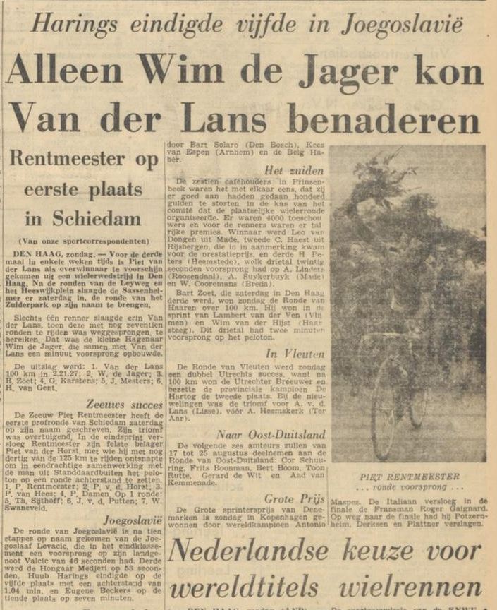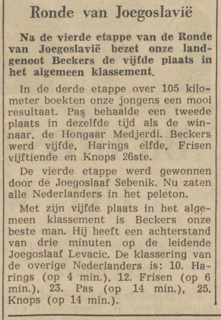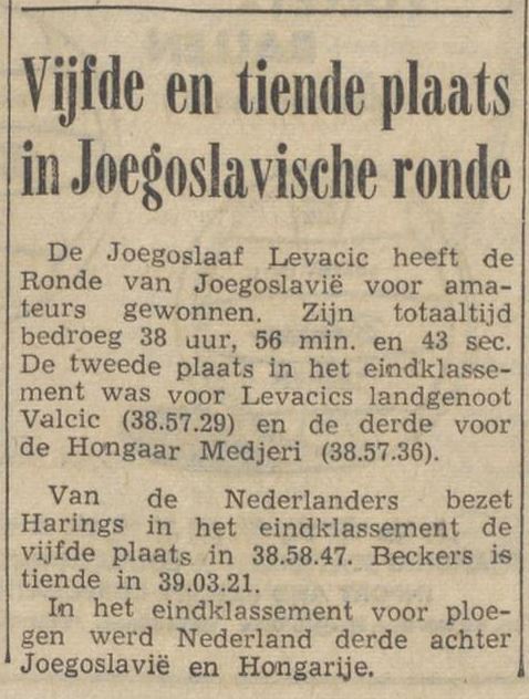 In de bijzonder zware, ook door de hitte, Ronde van Joegoslavië, kwam Nederlandse equipe (jaarlijkse selectie van TWC Maastricht) uitstekend voor de dag. Best werk werd ginder verricht, de uitslagen mochten er zeer zeker wezen en, ook een belangrijke factor, de ploeggeest was prima, zodat het kleine gezelschap welgemoed de terugreis kon aanvaarden.