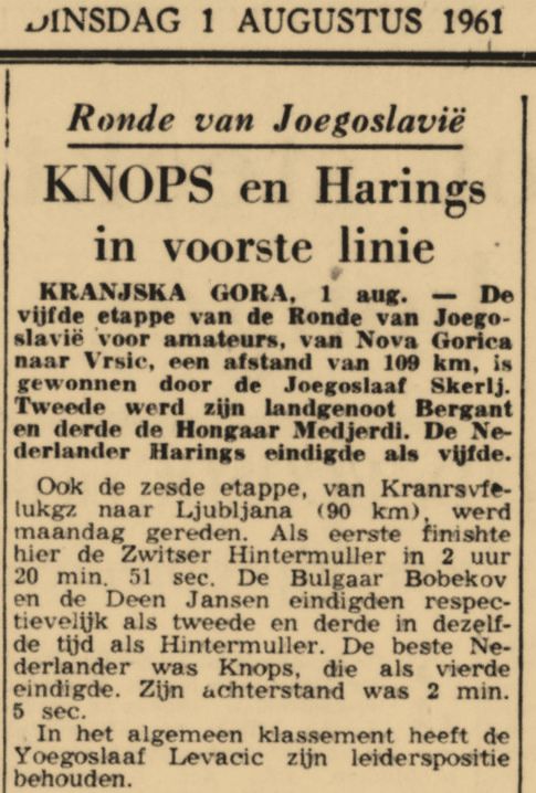 Harings 5e op de gevreesde Col de Vrsic. Een wapenfeit, dat gerust apart gememoreerd mag worden. De vijfde etappe werd in twee brokken afgedraaid: eerst de bergrit naar de top van de Vrsic (1611 meter) en na een rust van een paar uurtjes de tocht van Kransjska naar Ljubliano (87 km). Tijdens de bestijging van de bijzonder lastige Vrsic verraste de Joegoslaaf Skerlj, een individueel, vriend en vijand. Hij kwam na een briljante race met bijna 2 min. als winnaar boven. Op de helft van de klim had Nico Paas een voorsprong, in zijn eentje, van 2 min. Drie km voor de top moest Paas het hoofd buigen, werd door vele renners voorbij gestoken en kwam leeg gereden aan de finish.