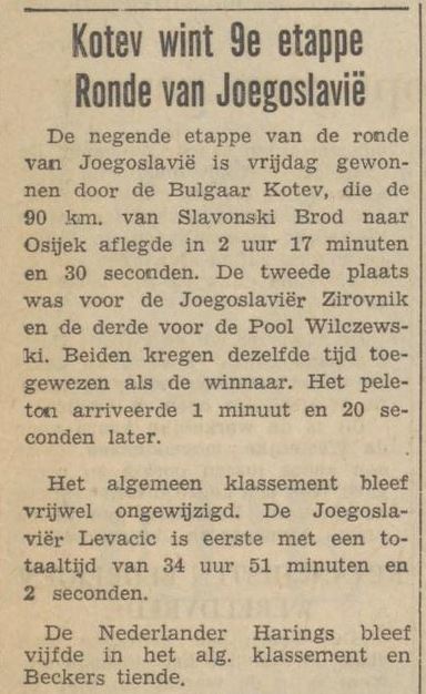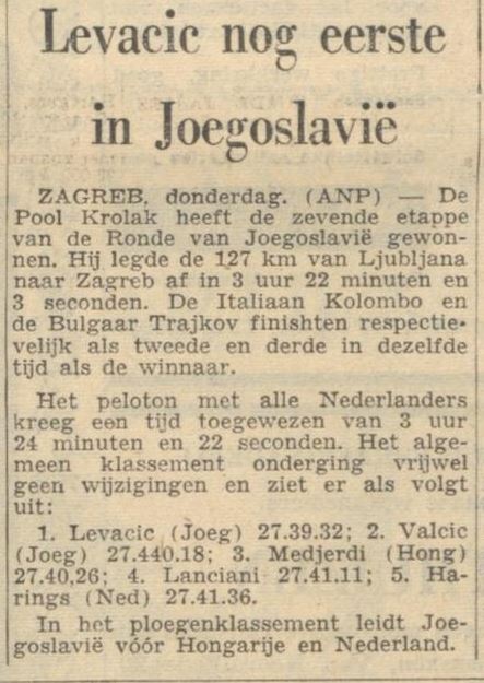Geen Nederlanders in de kopgroep van Ljubliana—Zagreb, verreden onder een schier ondragelijke hitte. Na 25 km sloegen Ananui, Radulescu, Balthazar en Krolak op de vlucht, werden door Valencic, Maho, Colombo en Trajkov ,,vervoegd” en dit achttal behield het gat van 2 min. Beckers scheen, in de groep, de negende prijs te gaan bemachtigen, doch kwam op de stadion-piste van Zagreb ten val.