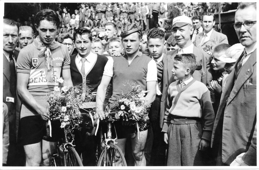De renners, die in dien verhoal vuurkome, han ich zelf bewonderd in de vieftiger en zestiger joare. Als trujje supporters van miene vrunk d’r Mien Vek oet Woabich gonge vier gidder zondig mit zes kameraadje ing koers in Limburg of zelfs tot La Calamine in ‘t Belsj bekieke. Inne van os moch dan d’r reservefiets van d’r Mien vaare. Zelf houwe v’r nit de fenninge um zoene sjunne Eroba of Rih aa te sjaffe. Bovendien fealde ‘t os aa talent um mit die echte mit te kenne doee. D’r Mien voer als nieuweling in dezelfde tied van o.a. d’r Gene Beckers van Nujjenaage, d’r Jean Bastin oet Voelender, d’r Ben Fransse van Ubachsberg, d’r Jan Tummers en d’r Sjef Drumme. Och inne jongere broor van d’r durch dich geneumde Lei Knops, d’r Huub, doog in die kattegerie zieng bes, jammer vur hem mit minder succes wie ziene groete broor. Doavuur wor hea wal erg sympathiek. De jonge die durch dich besjrieve zind, reeje toen al as amateur of onafhankelijke. D’r Jan Hugens wor inderdaad inne geweldeneer, Wen se dem tien meter goofs, wor hea fleute. D’r Lei Knops wor als sjlechter’s zoeen sjterk wie ee plead en d’r Huub Harings wor taai en sjlauw wie inne oet Subbe.